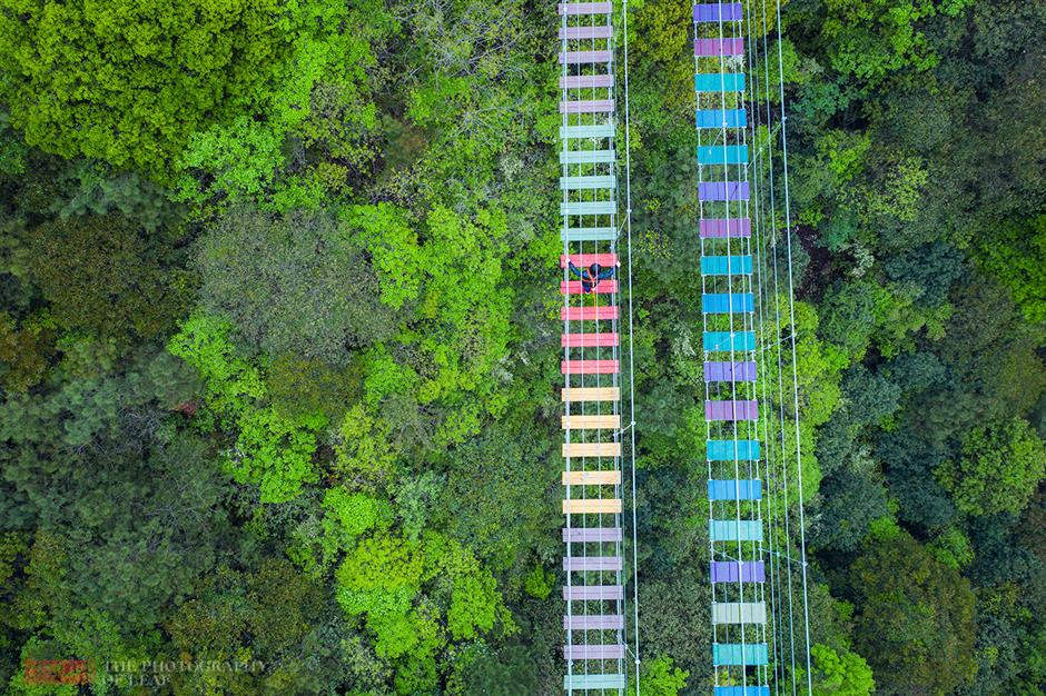 a visitor walks on a bridge over lush greenery in xiangshan.