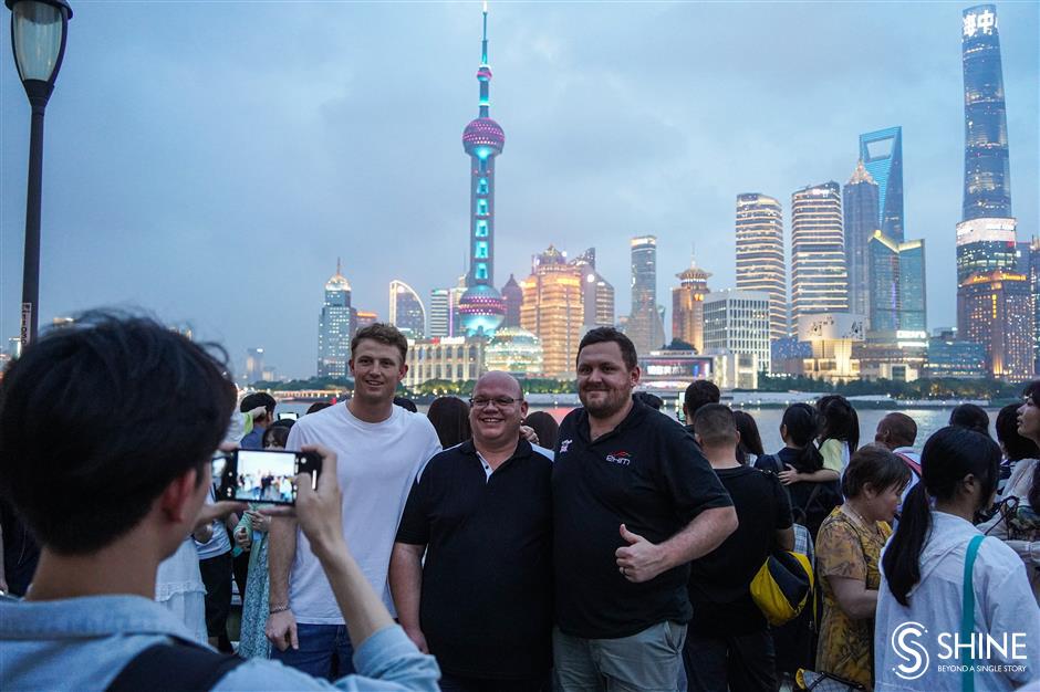 foreign travelers pose for photos on the bund.